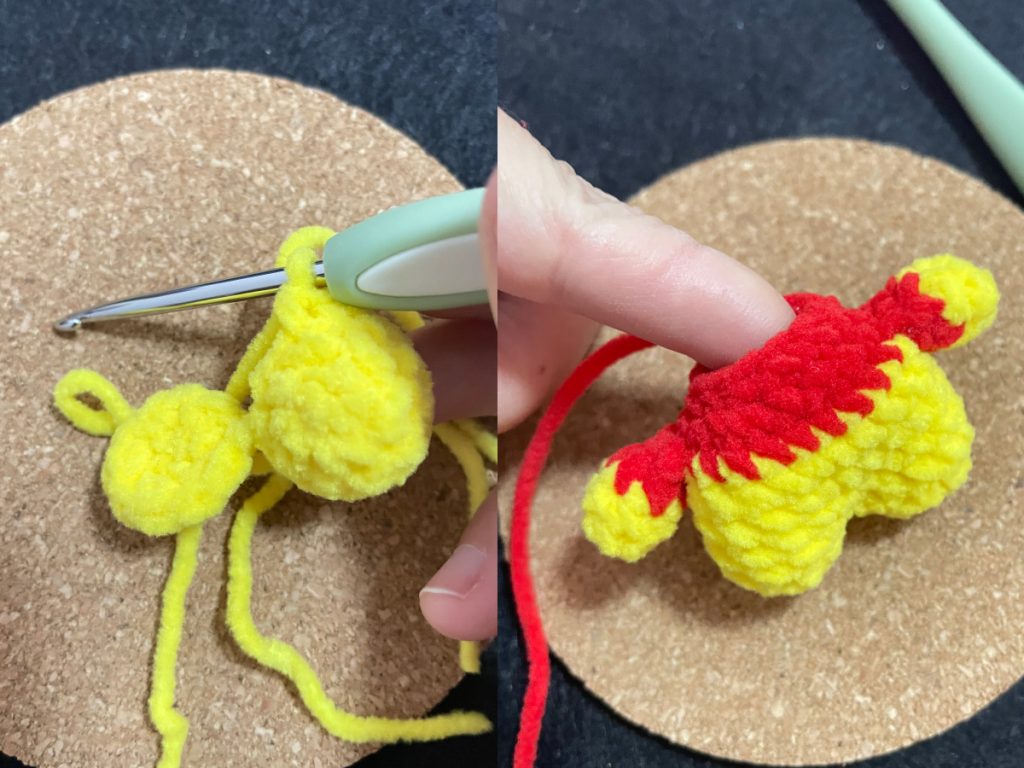| R3 | Switch to red yarn. 6X | 6 |