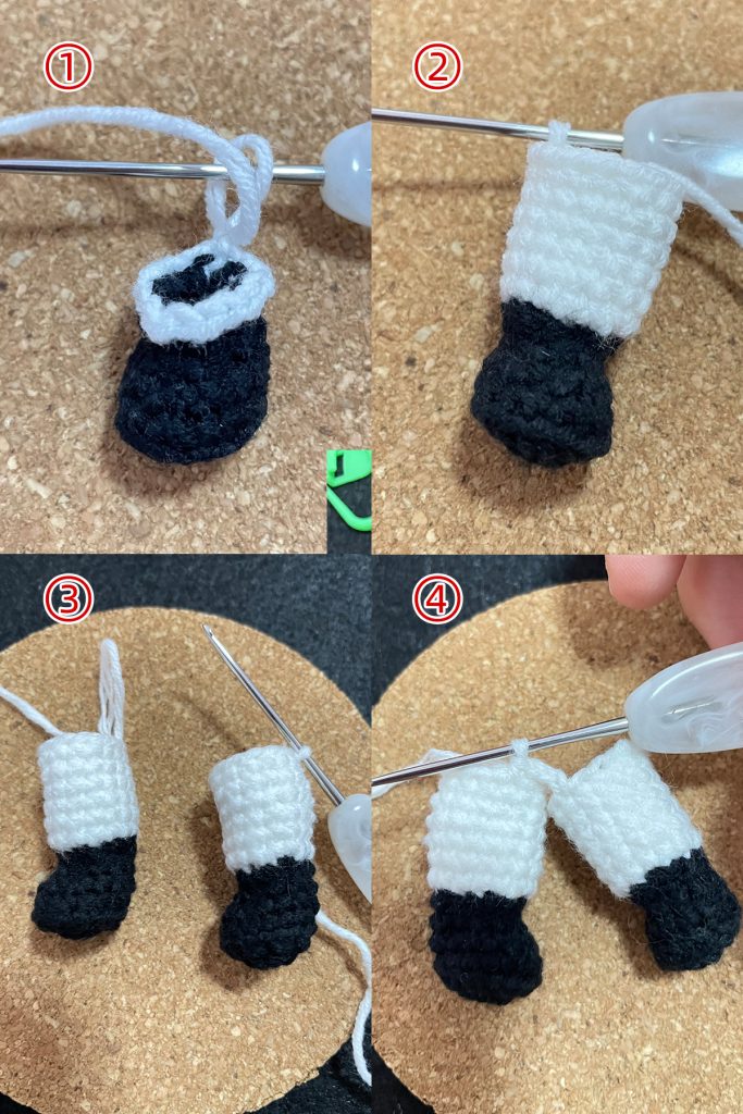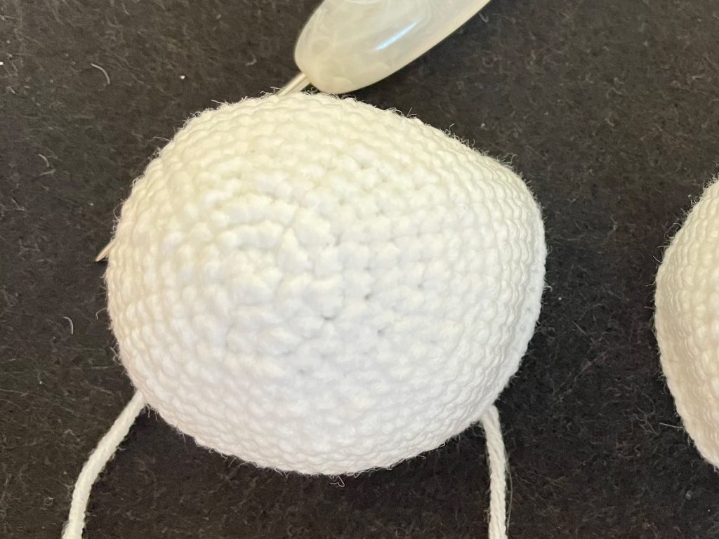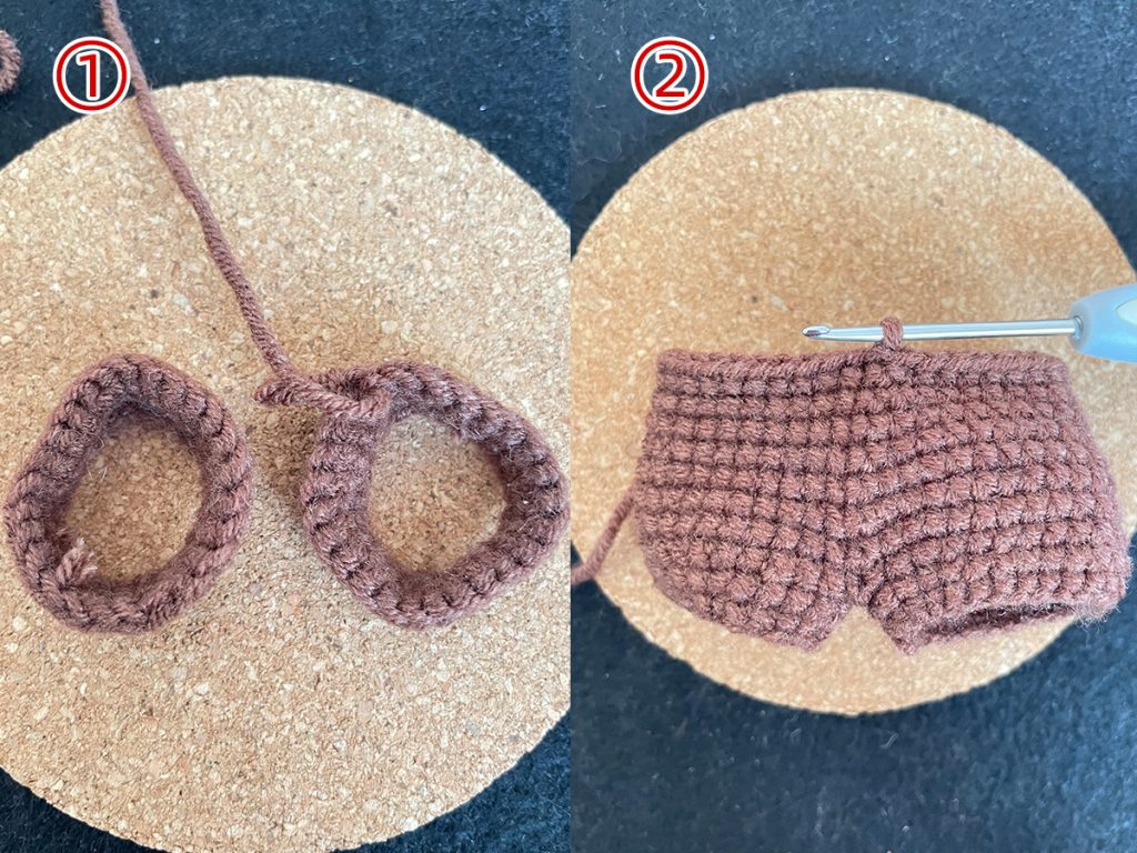 R13Break the yarn at the two legs, then sew the inner mid-sections of the legs together with a strand of yarn.