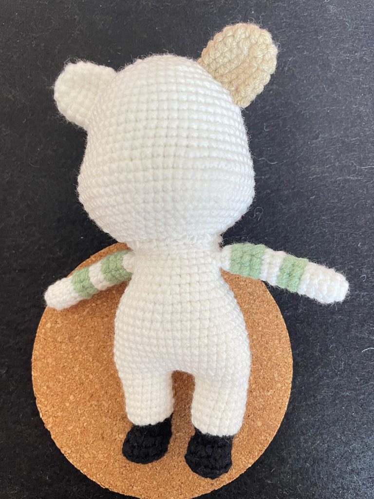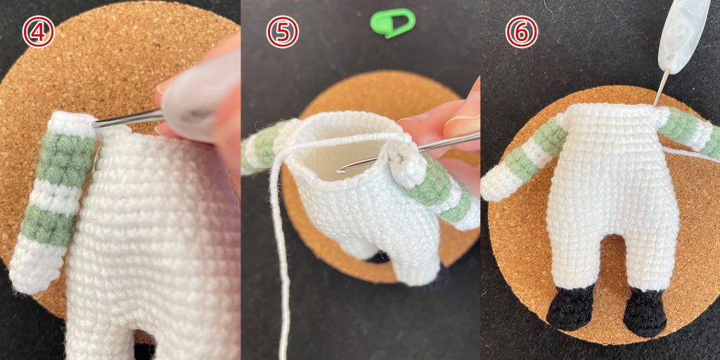 Crochet 5 single crochets (sc), attach the arm and crochet 4X, 6X, 6X, 4X, 5X