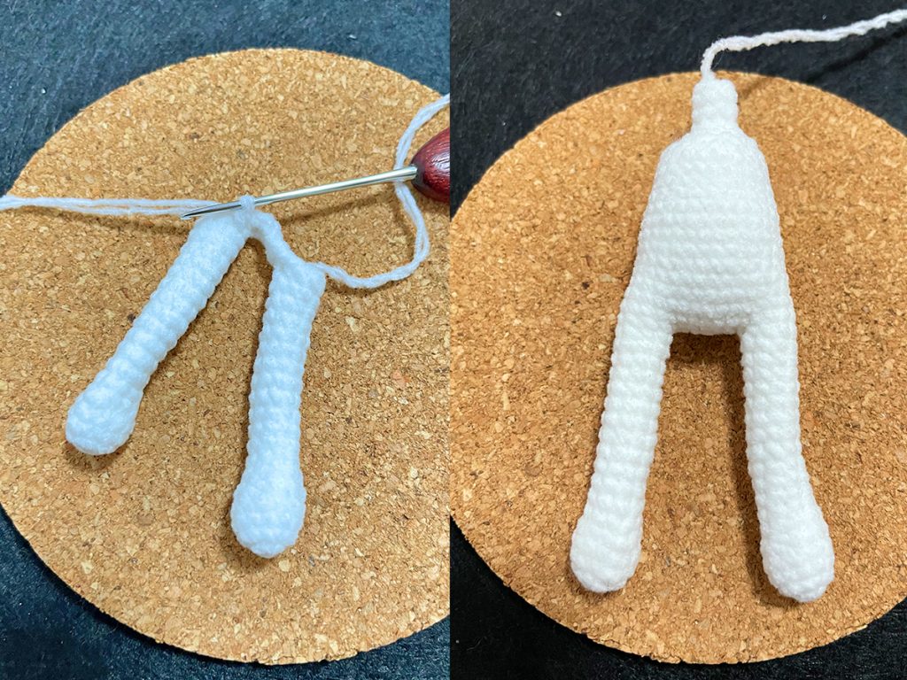 R19After crocheting the second leg, chain 7 (ch 7), then join the two legs together and continue crocheting.