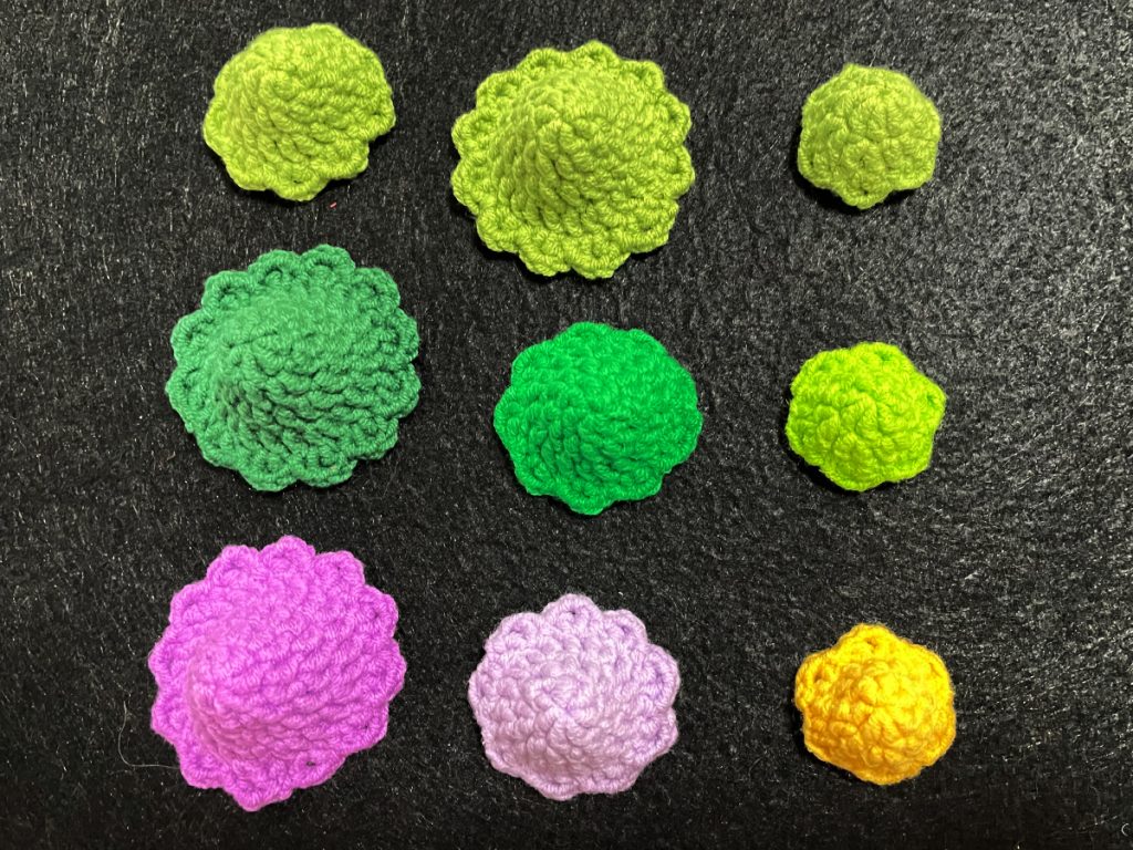 The main stitch used is the double crochet (dc) (abbreviated as F).
